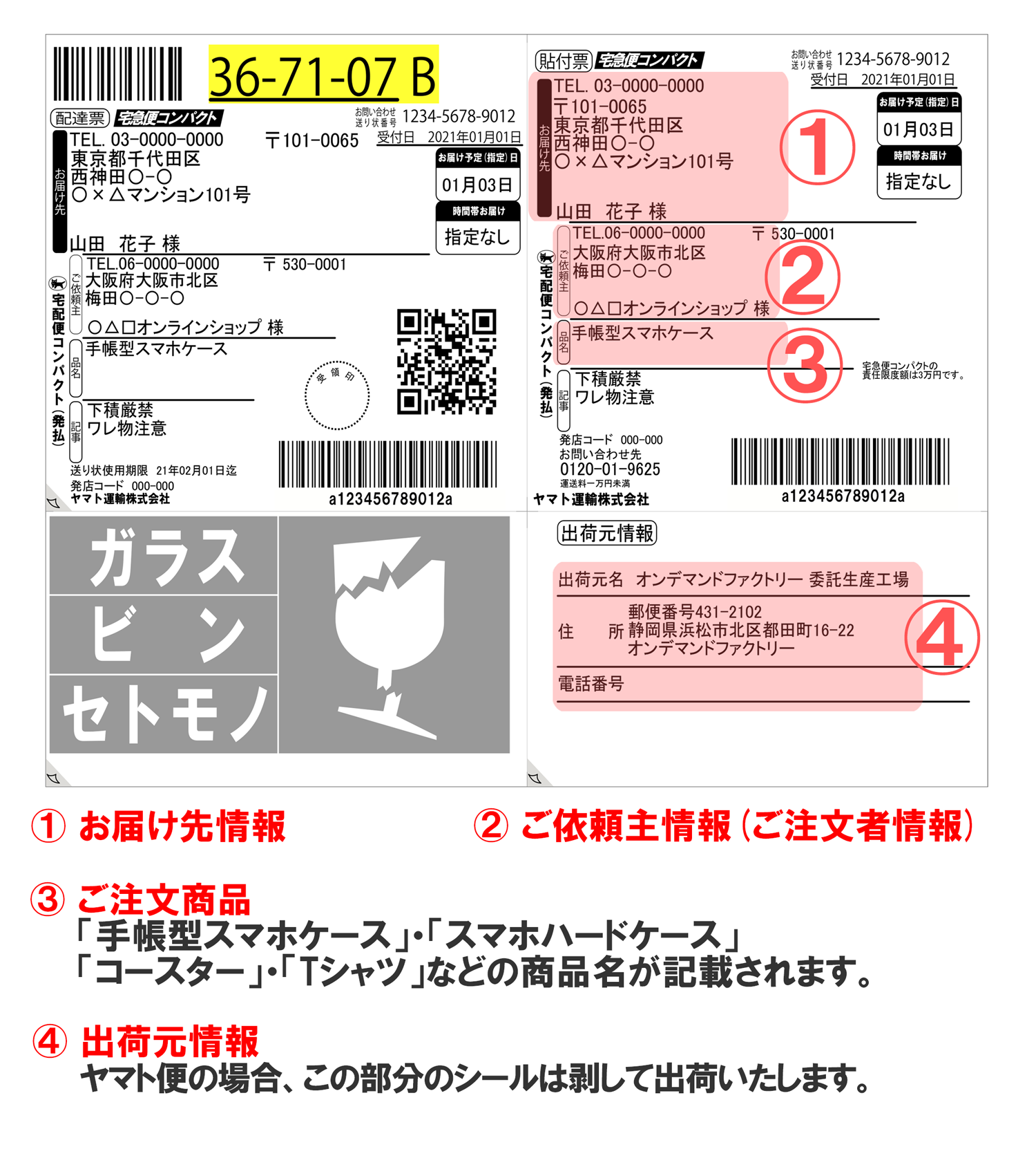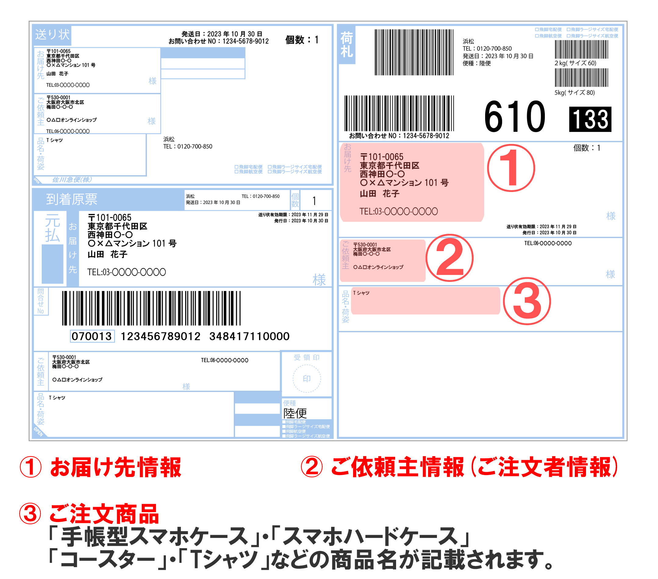 佐川急便、及びヤマト運輸の宅配便をご利用の際は「ご依頼主(出荷元の名称)」がご注文者様の名称(法人名・小売販売店名・ECショップ名・クリエイター名、及び学校法人名)となります。