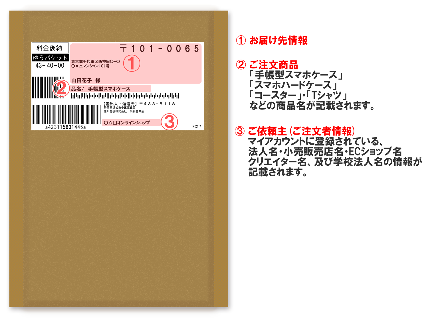 「飛脚ゆうパケット便」の送り状は佐川急便の送り状発行システムを利用いたしますので、『差出人・返信先』は佐川急便となりますが、「ご依頼主(出荷元の名称)」はご注文者様の名称(法人名・小売販売店名・ECショップ名・クリエイター名、及び学校法人名)も印字されます。
